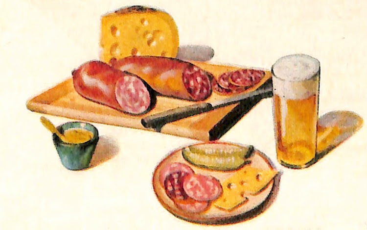 The beer-drinking audience is about to enjoy some salami and cheese.