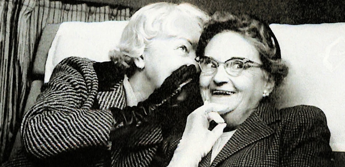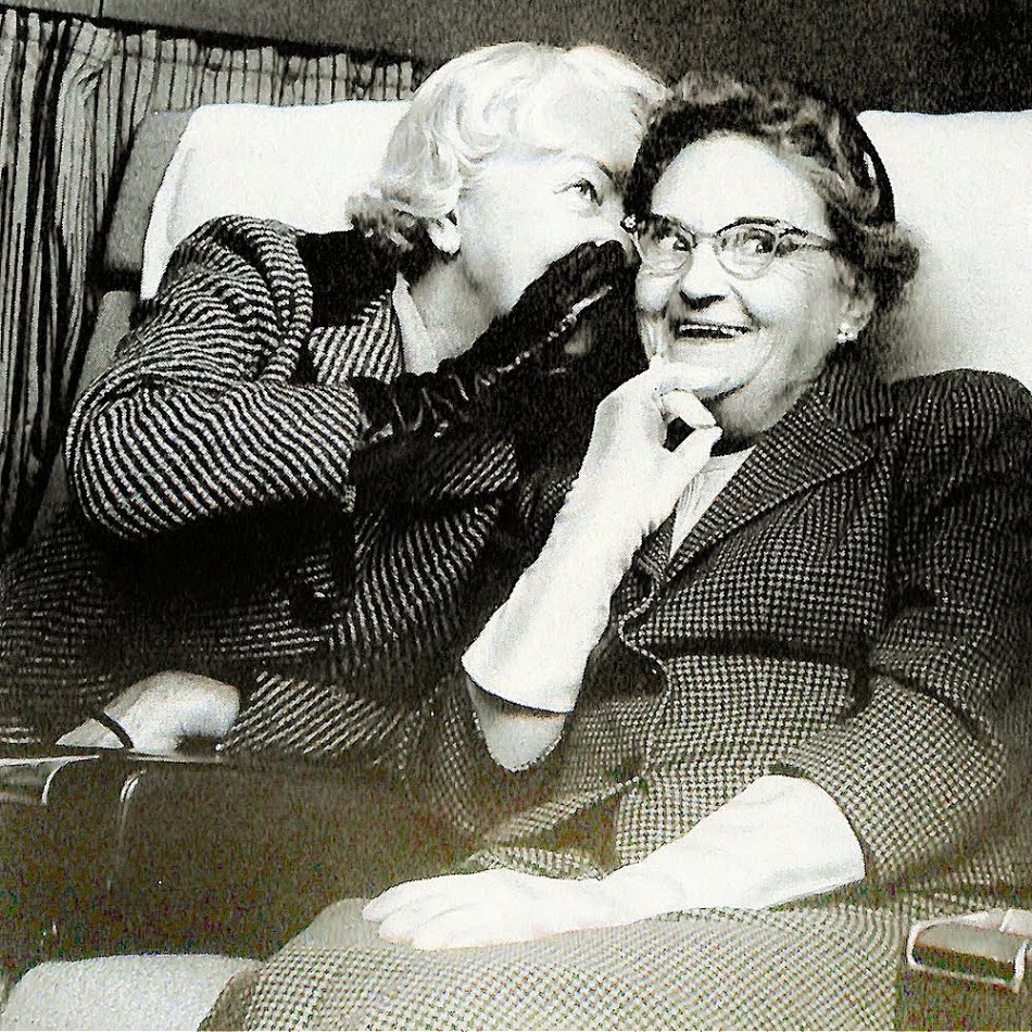 The two charming women are on a trip. Dressed in gloves and classic tweed, the grandmas are having an obvious good time. Look close to see that they are sitting in a row of an airplane. Shall we assume that they are flying to a special destination? Italy perhaps?