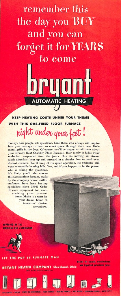 Here is an ad for Bryant Automatic Heating. It is advertising their Gas-Fired floor furnaces.