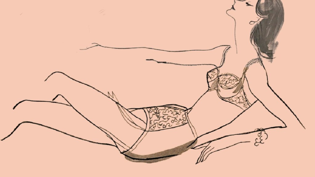 The article highlights 1950s fashion, emphasizing undergarments’ role in achieving trendy silhouettes, complemented by vibrant illustrations and color suggestions.