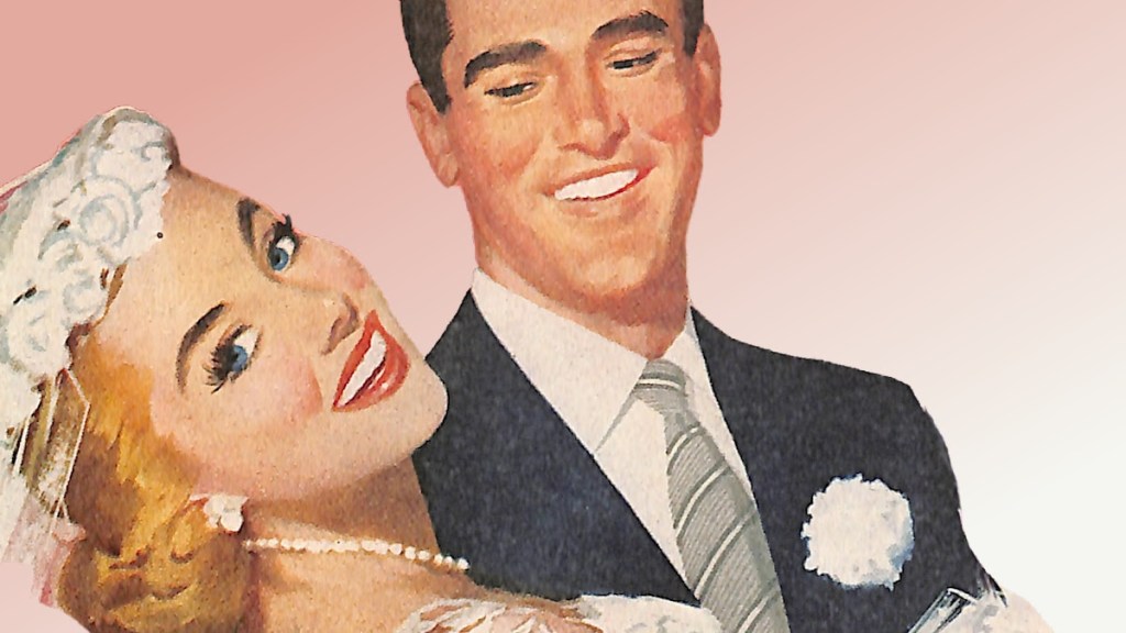 The smiling bride and groom from a May 1956 Charm magazine ad illustrated mid-century advertising trends, promoting Viv lipstick with a romantic aesthetic.