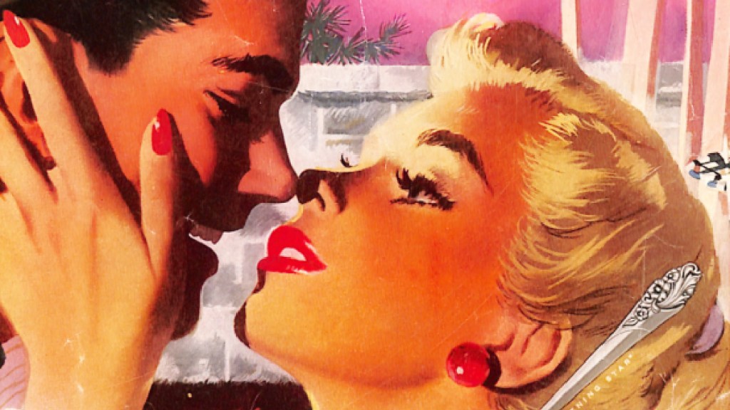The content highlights love-themed vintage advertisements from mid-century women’s magazines, celebrating romance and nostalgia.