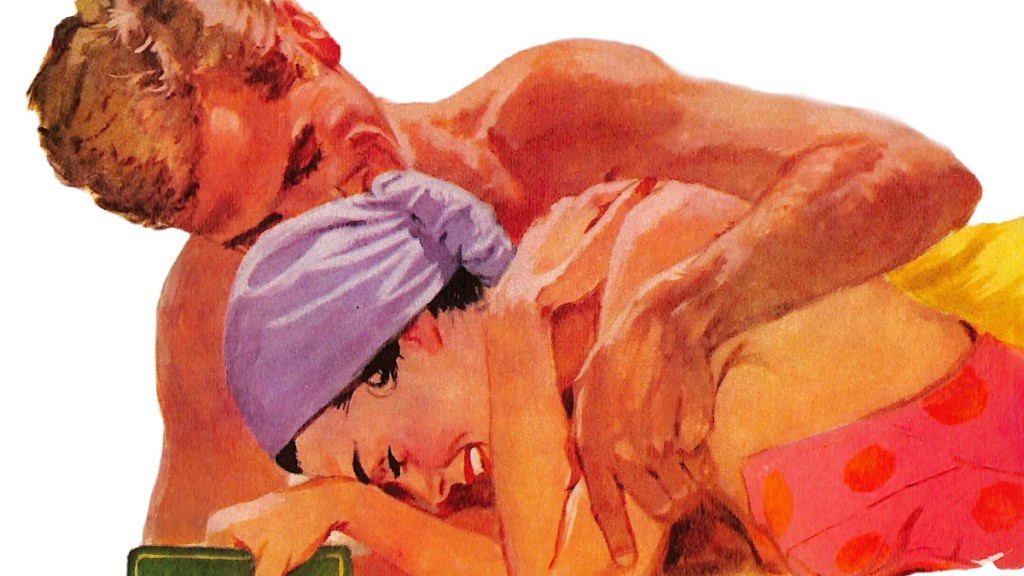 Thornton Utz’s illustrations in Cosmopolitan March 1959 accompany Robert A. Knowlton’s short story, depicting romantic scenes in a beach and hotel setting.