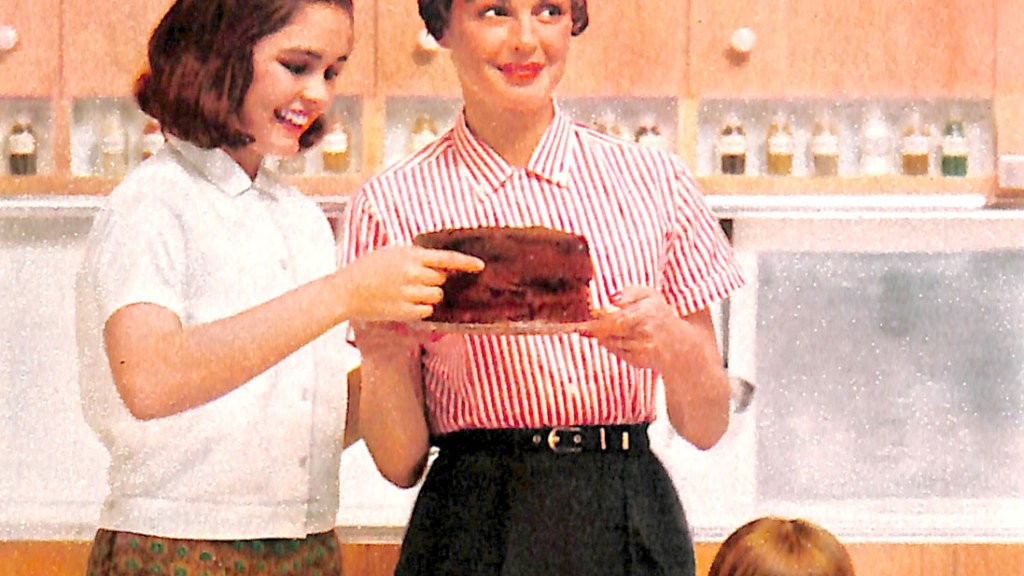 Bluebell sportswear ad from 1959 showing a mom and her 2 daughters wearing crops while making a cake.