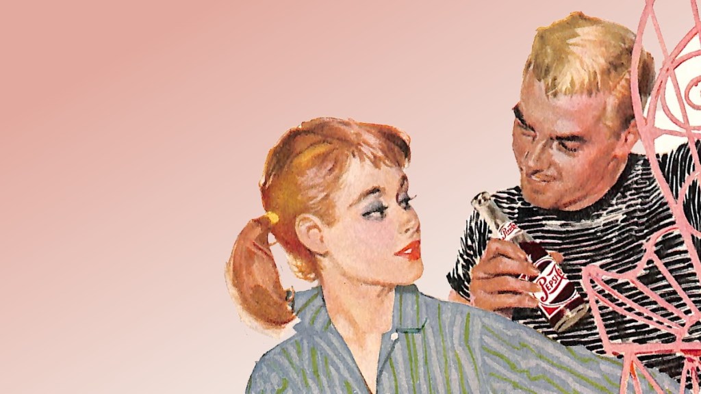 Mid-century Pepsi advertising highlighted its cultural significance and profit potential, showcasing ideal couples enjoying refreshing, lower-calorie drinks.