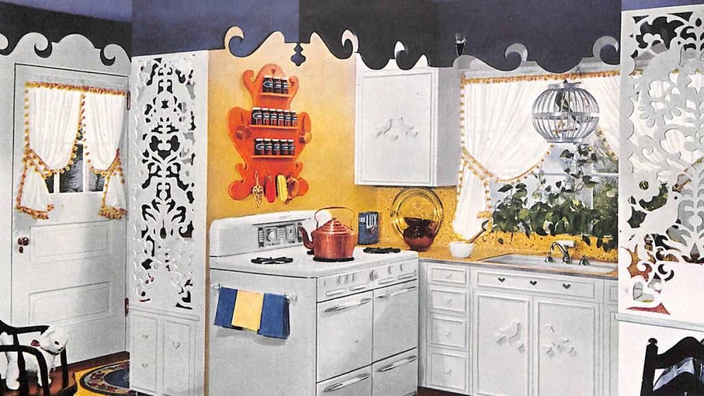 A mid-century kitchen with white cabinets and a yellow Spatter Linoleum floor from Armstrong.